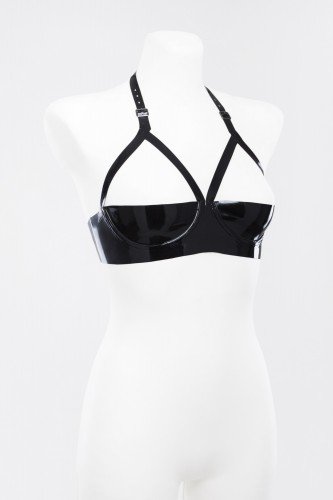 Латексный бюстгальтер с открытой грудью плотно прилегает к телу, подчеркивая изгибы тела и создавая соблазнительный силуэт. Регулируемые бретели обеспечивают удобную посадку, а застежка сзади позволяет легко надевать и снимать бюстгальтер.