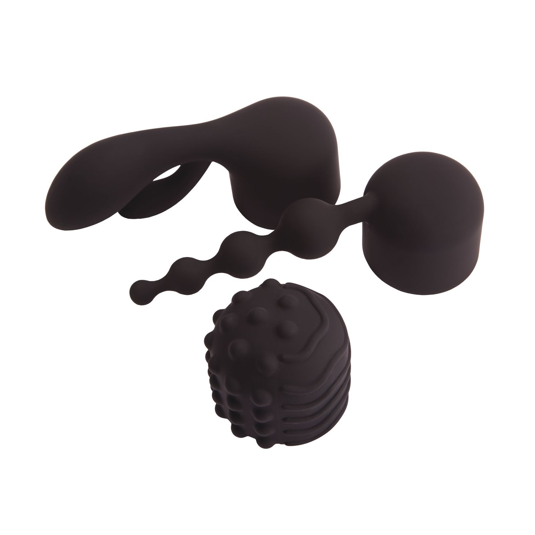 • интимный аксессуар предлагается с тремя силиконовыми насадками – гладкой насадкой с анальной цепочкой, деталью с клиторальным кроликом, рельефной головкой;